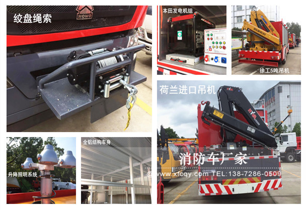 駕駛室頂部前端為長排警燈,車身后配有24V/60W火場照明燈一只,車輛兩側(cè)上方各配有紅藍相配的爆閃燈,下方安裝安全標志燈,乘員室、器材箱、 泵房內(nèi)均裝有照明燈,加裝有100W警報器,回轉(zhuǎn)警燈開關、通訊設備預備接口。